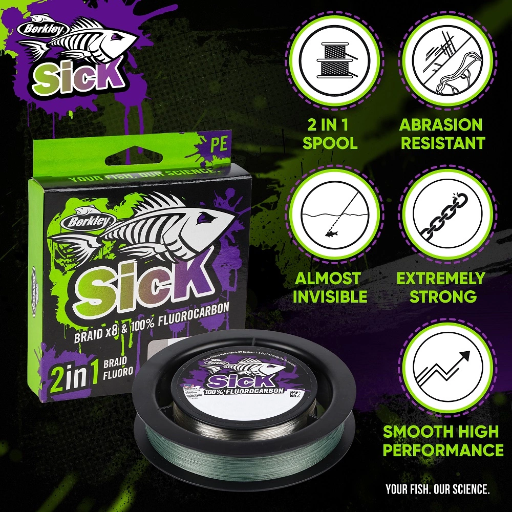 A clever addition to Berkley sick range of high quality lines and braid that gives you a 2 in 1 spool carrying 150m of moss green 8 strand Sick braid, along with an additional 50m of Sick fluorocarbon leader material. Enough braid to comfortably load up your reel, and enough leader material to keep you going for a while. A great way to save having to buy separate spools, and taking the guesswork out of matching the line strengths and breaking strains. Perfect for outfitting your lure setup for both fresh and saltwater.