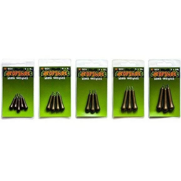 Drennan’s E-Sox dropshot bomb weights feature a specially designed bulbous base to enable them to pivot while still holding bottom. This allows you to impart even more subtle and lifelike movements into a Dropshot Lure without actually moving the bomb. The bulbous shape also helps with casting accuracy while the camo coating helps them to blend into the bottom. Your line simply locks into the special swivel, without the need for knots, so you can adjust the length of the drop shot tail easily. This also means a bomb can safely disengage should it become heavily snagged. Bomb Weights are