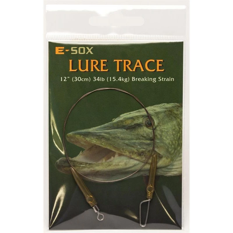 The Drennan E-SOX Lure Trace, ideal for plugs, lures and large jigs and constructed from nylon coated E-SOX Super Trace Pike Wire. Featuring a strong size 9 swivel and a secure easy to use snap link at the business end. Special crimps maintain the wires full breaking strain, then covered with a streamlined sleeve to prevent tangles.