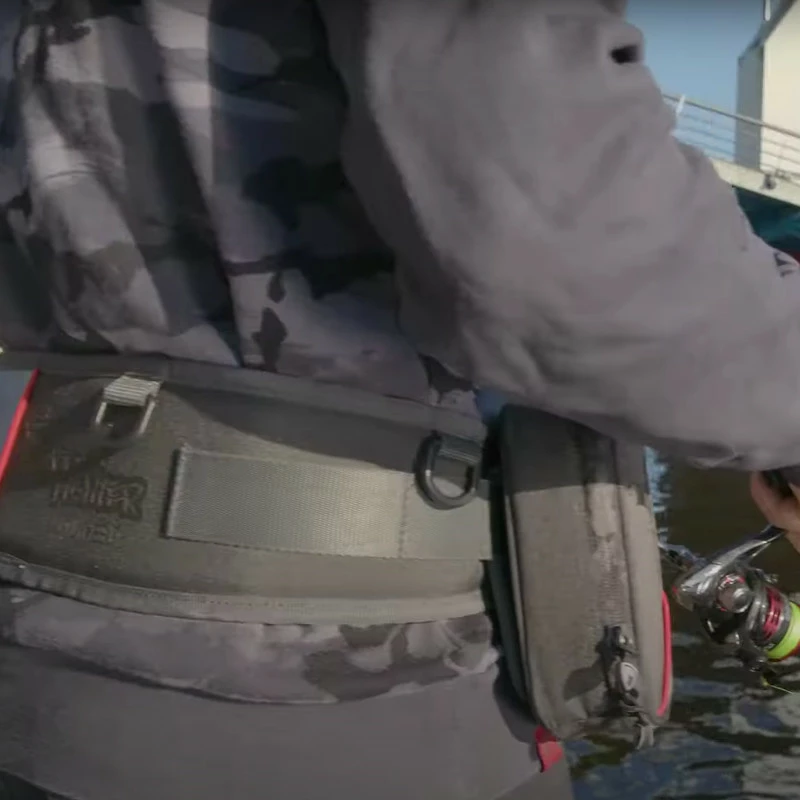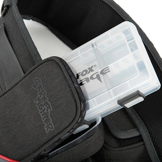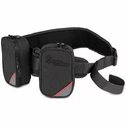 The Fox Rage street fighter utility belt, this clever idea simply clips round your waist with a secure buckle, and comes with two modular pouches. The pouches come preloaded, each with an X-small Rage tackle box inside. More of these pouches can be purchased separately and added to the belt for even more storage. With a series of D rings to attach any accessories, plus a net holder designed to retain a street fighter net.Â