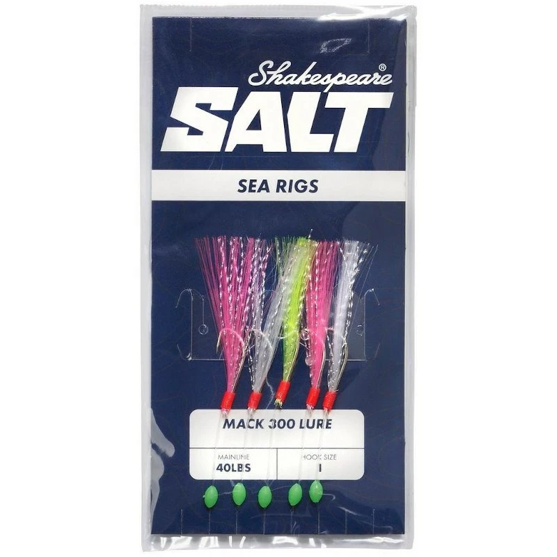 A highly reflective five hook pattern with a series of multicoloured teasers. Each hook has a tiny green oval bead above the eye.